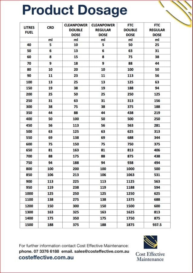 Regular Dose: 1L of FTC to 1600L of Fuel.